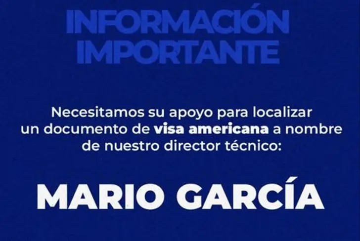 “Necesitamos su apoyo para localizar un documento de visa americana a nombre de nuestro director técnico Mario García. Tendremos una recompensa, agradecemos su apoyo”, dice el posteo que hizo el club blanquiazul.