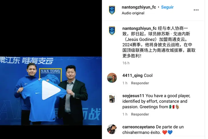 Godínez firmó con el club Nantong Zhiyun de la Superliga China, de hecho, su nuevo equipo lo presentó en sus redes sociales con un video donde el atacante sale en un restaurante pidiendo un burrito en chino, y entre los comentarios en el posteo, destacó el de un morado de corazón.