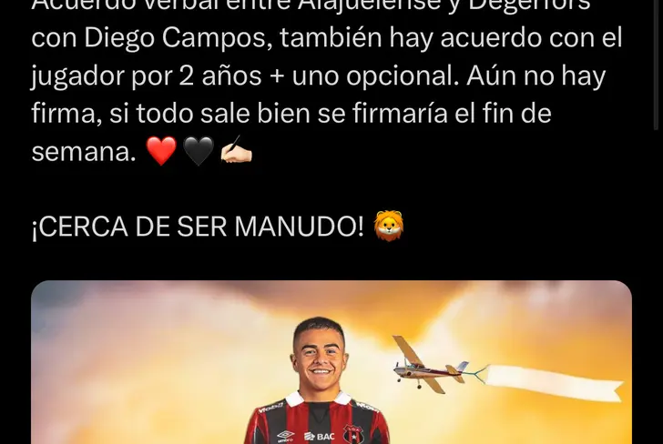 “Acuerdo verbal entre Alajuelense y Degerfors con Diego Campos, también hay acuerdo con el jugador por 2 años + uno opcional. Aún no hay firma, si todo sale bien se firmaría el fin de semana”, escribió el comunicador Kevin Jiménez en sus redes sociales.