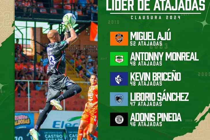 En el quinto lugar se encuentra Adonis Pineda del Sporting FC con 46 atajadas, quien fue líder de tapadas del torneo anterior con 70, superando a arquero como Kevin Chamorro.