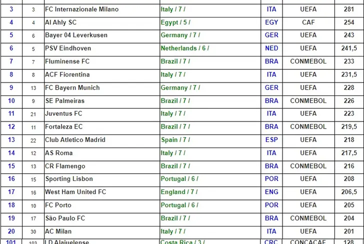 Por otra parte, el Manchester City de Inglaterra está a la cabeza del ranking. El podio de los mejores cinco los completan Real Madrid (España) e Inter (Italia), Al Ahly SC (Egypto) y el Bayer Leverkusen de Alemania.