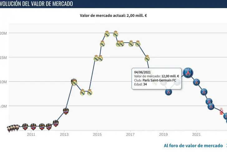 Una vez fichado por el PSG, en el 2019, tuvo un valor de 10 millones de dólares e incluso en el 2020,con 33 años, llegó a registrar solo 8.