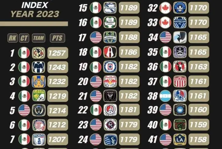 El primer lugar de la clasificación lo ocupa el América de México, club que recientemente se alzó con la corona. Sus más cercanos perseguidores es el Monterrey, Tigres, León y Philadelphia de la MLS.