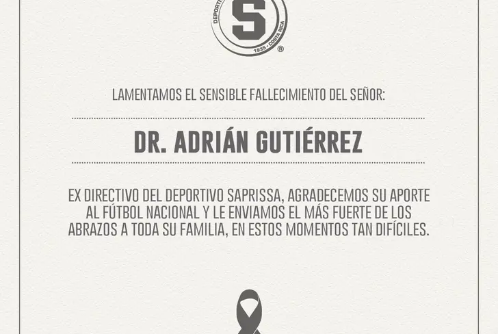 “Lamentamos el sensible fallecimiento del señor Doctor Adrián Gutiérrez, exdirectivo del Deportivo Saprissa. Agradecemos su aporte al fútbol nacional y le enviamos el más fuerte de los abrazos a toda su familia, en estos momentos tan difíciles”, escribieron el posteo que subieron a sus redes sociales.
