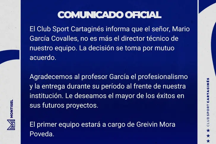 “Cartaginés informa que el señor Mario García no es más el director técnico de nuestro equipo. La decisión se toma por mutuo acuerdo”, dice el boletín.