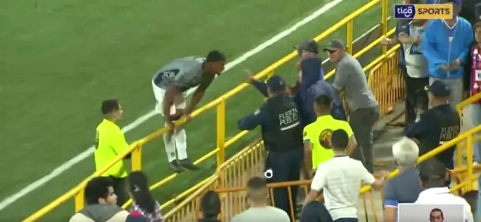 El video fue publicado por el canal Tigo Sport y se aprecia cómo el atacante se iba a dar a de golpes con un seguidor brumoso, le gritó cosas y si no es por la intervención de la Fuerza Públicas, todo hubiera terminado peor.