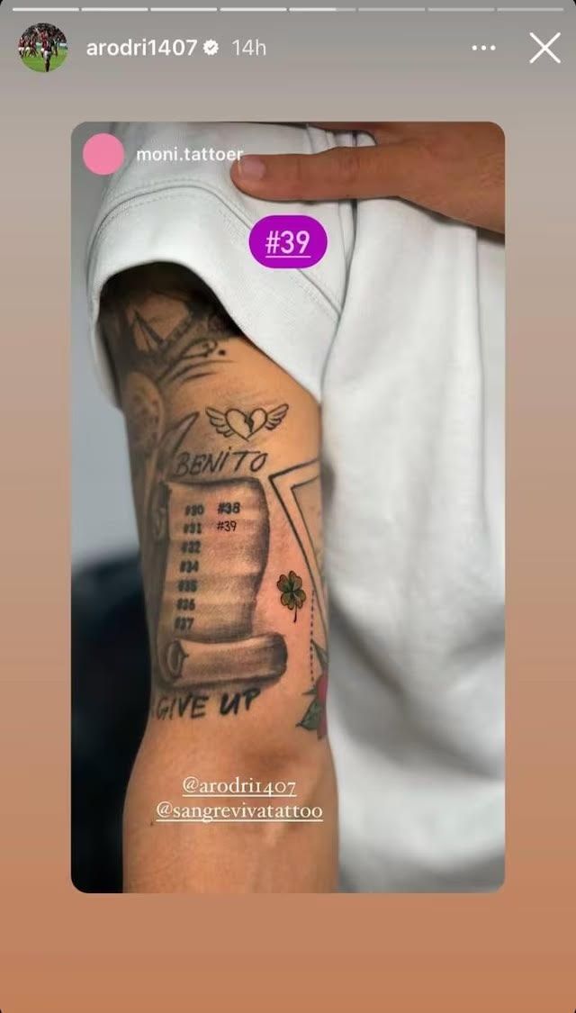 El atacante decidió tatuarse un pergamino con los números del 30 al 39, esos son los títulos que ha ganado con el Sapri, en un momento que le sienta bastante bien, ya que el club está de vacaciones y ahora le queda tiempo para recuperarse y sanar su piel.