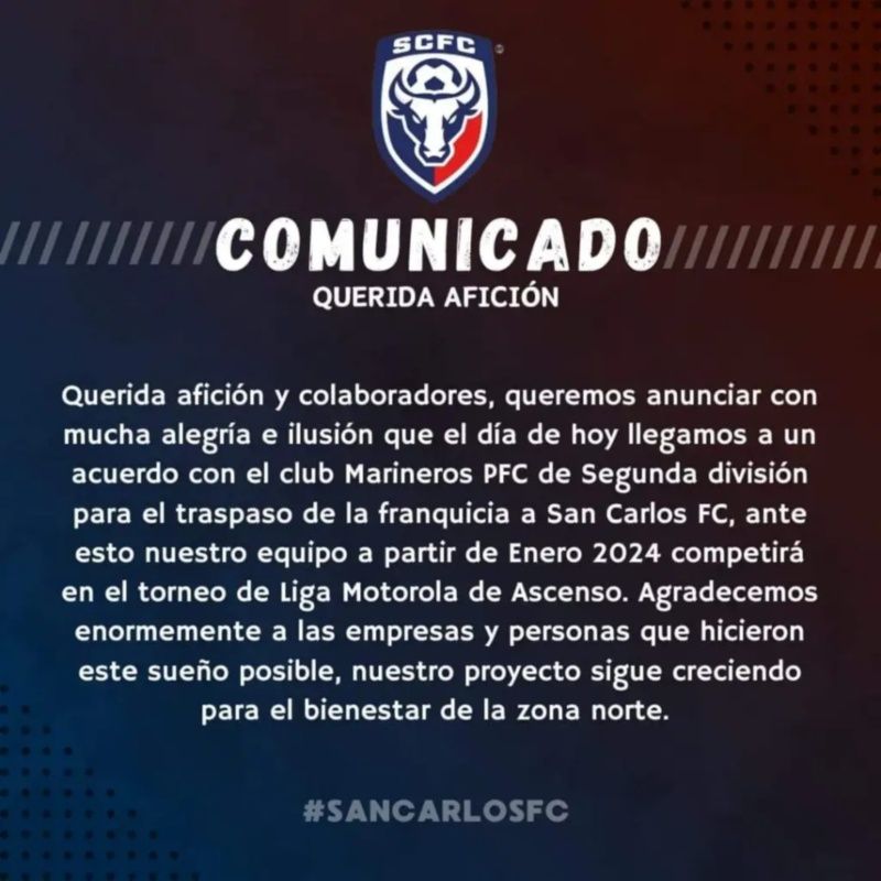 “Llegamos a un acuerdo con el club Marineros PFC de la Segunda División, para el traspaso de la franquicia a San Carlos F.C., ante esto, nuestro equipo competirá a partir de enero en la Liga Motorola de Ascenso”, se lee en el comunicado de prensa.