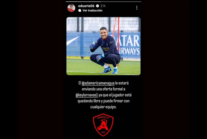 “El América de Managua le estará enviando una oferta formal a Keylor Navas, ya que el jugador está quedando libre y puede jugar con cualquier equipo”, publicó Duarte en su Instagram en medio de la dura realidad que vive el portero.